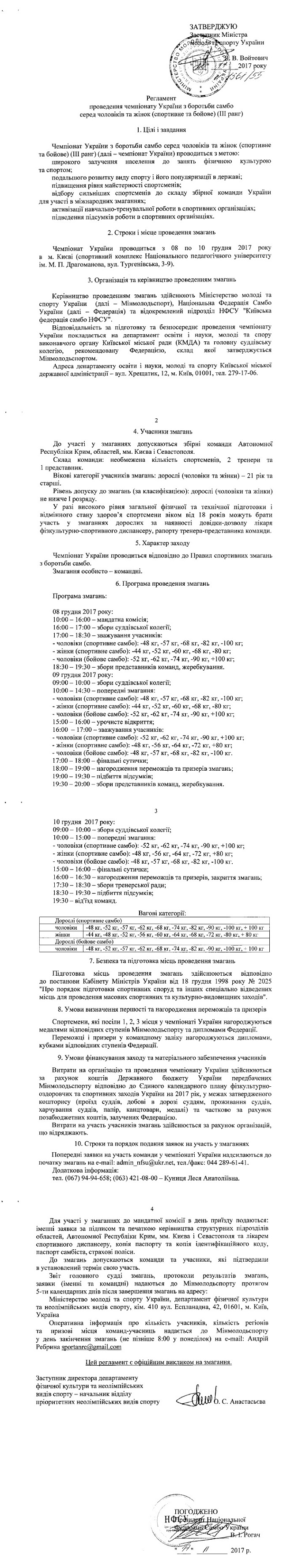 · чоловіки (спортивне самбо): -52 кг, -62 кг, -74 кг, -90 кг, +100 кг;