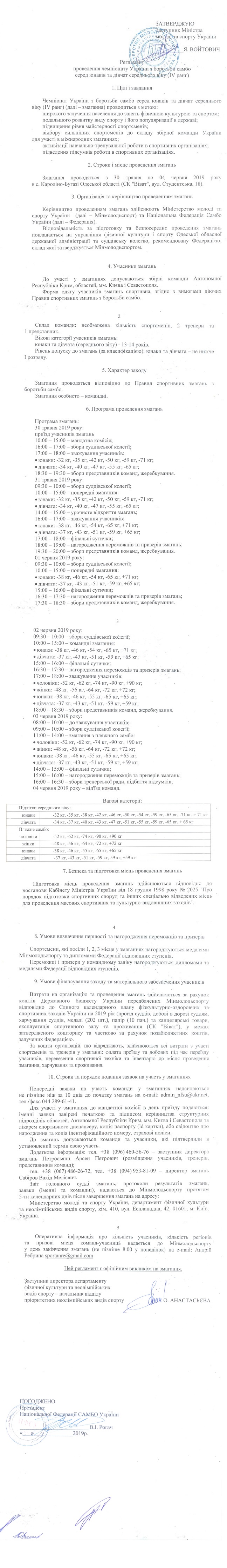 Положення буде на початку наступного тижня. Чемпіонат України серед юнаків і дівчат (2005-2006 роки, 2007 допускається за особливими умовами): 30 - день приїзду, 31, 1 і 2 змагання; 3 - чемпіонат України з пляжного самбо у двох вікових категоріях: дорослі - понад 16 років, молодь - до 16 років (тобто всі учасники чемпіонату України серед юнаків і дівчат середнього віку можуть брати участь).