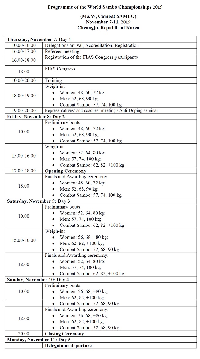 8, 9 і 10 листопада в корейському місті Чхонджу, що в 130 кілометрах від Сеула, пройде чемпіонат світу серед чоловіків і жінок зі спортивного й бойового самбо. Змагання відбудуться у спорткомплексі "Sukwoo Culture Gym".