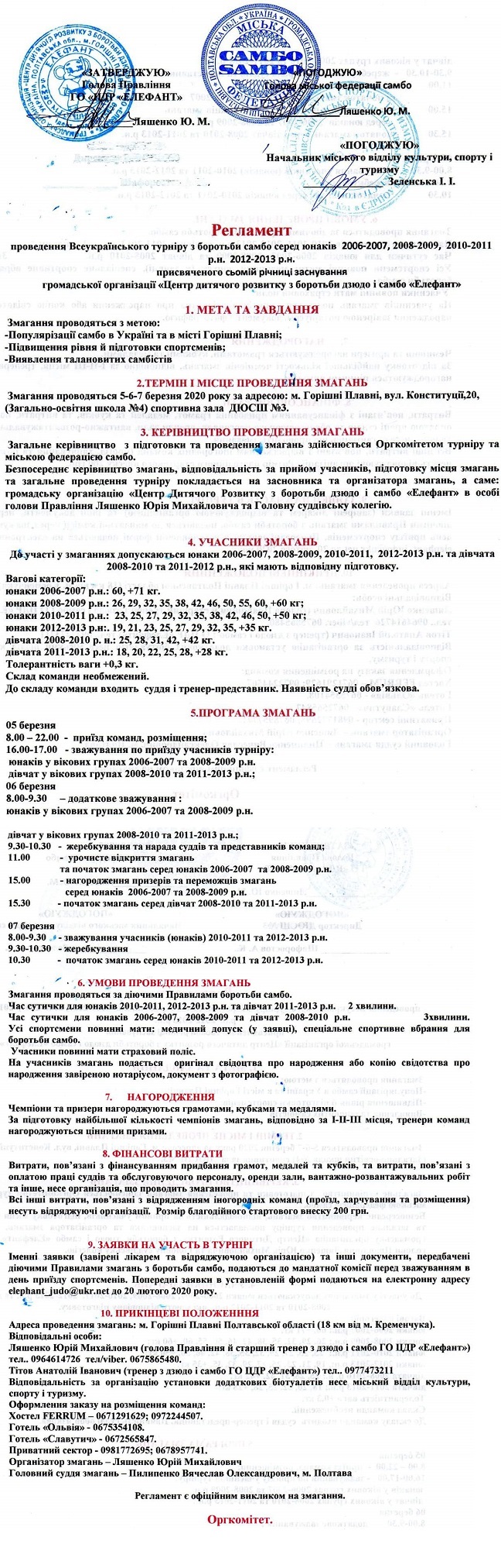 6 і 7 березня у місті Горішні Плавні Полтавської області розіграють призи Всеукраїнського турніру до сьомої річниці центру самбо і дзюдо "Елефант". На змагання запрошуються юнаки і дівчата 2006 - 2013 років народження.