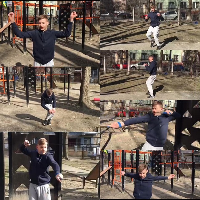 Брати Ниники, Дмитро Вітковський, Саша Корнійчук виконують запропонований комплекс.