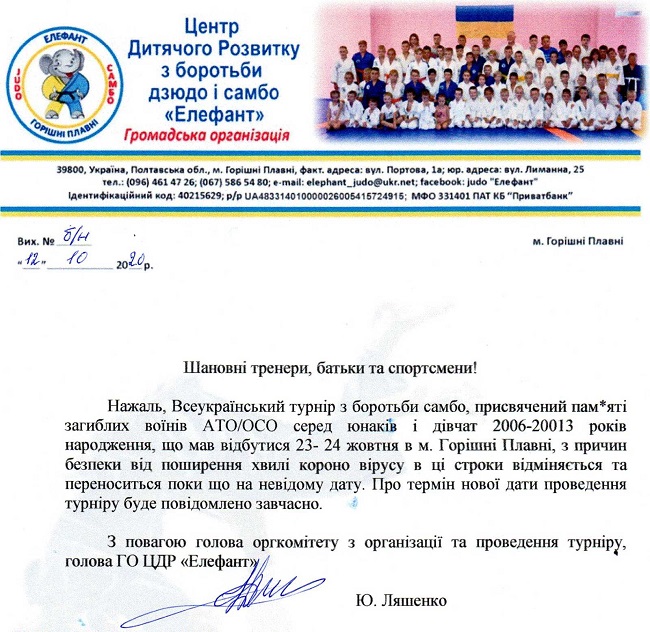 Перенесено терміни проведення турніру у Горішніх Плавнях, який було заплановано на 23-24 жовтня.