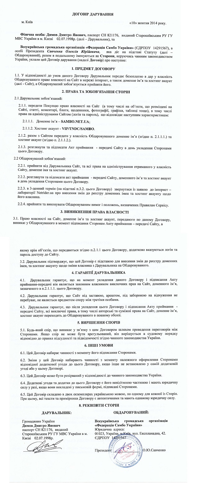 Дмитрий Дымов, создатель и собственник сайта SAMBO.NET.UA, подарил право собственности на сайт Федерации самбо Украины.