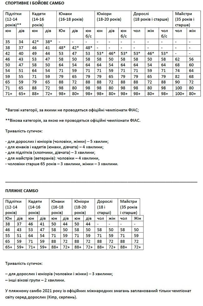 Як було повідомлено навесні минулого року, з початку 2021-го Міжнародна федерація самбо запровадила нові вагові категорії. Природно, що у правилах змагань в Україні відбулися відповідні зміни.