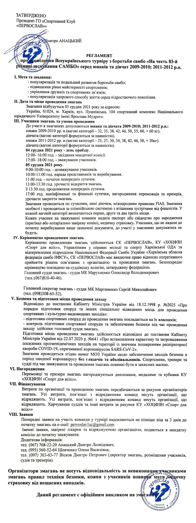 5 грудня у Харкові пройдуть поєдинки Всеукраїнського турніру "На честь 83 річниці заснування самбо" серед хлопців і дівчат 2009 - 2012 років народження. 4 числа - день приїзду. До вашої уваги - регламент змагань.