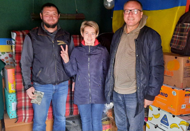 На складі "Морозівської хунти" на Київщині. Волонтери Сергій Адамя'к, Руслана Самаєва і Олексій Гончарук, режисер фільму, голова прес-служби й очільник пляжного самбо НФСУ, офіцер 1 окремої танкової Сіверської бригади.