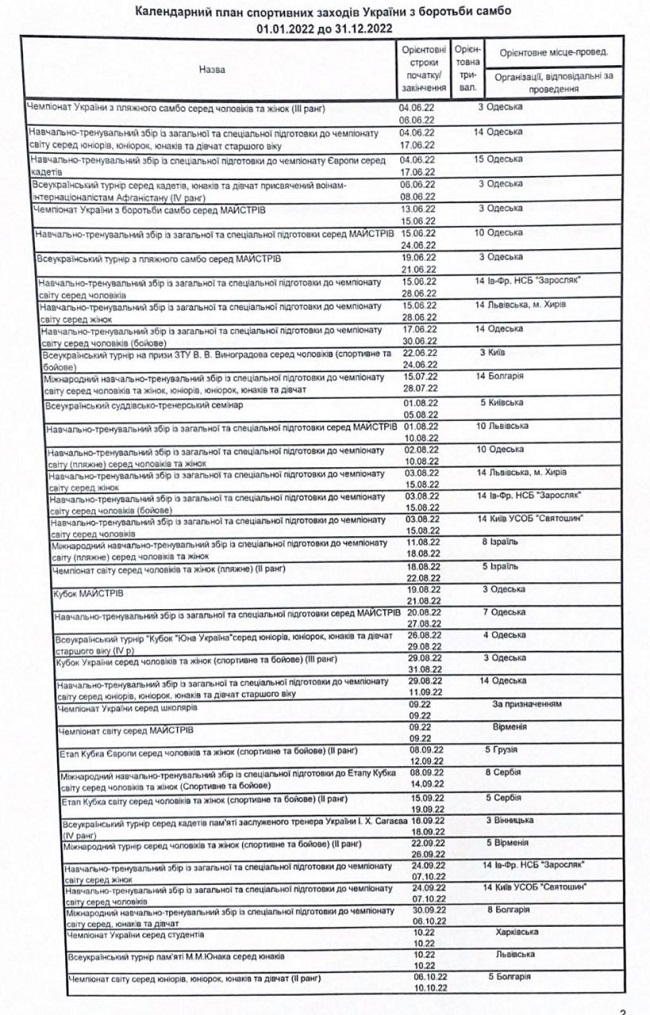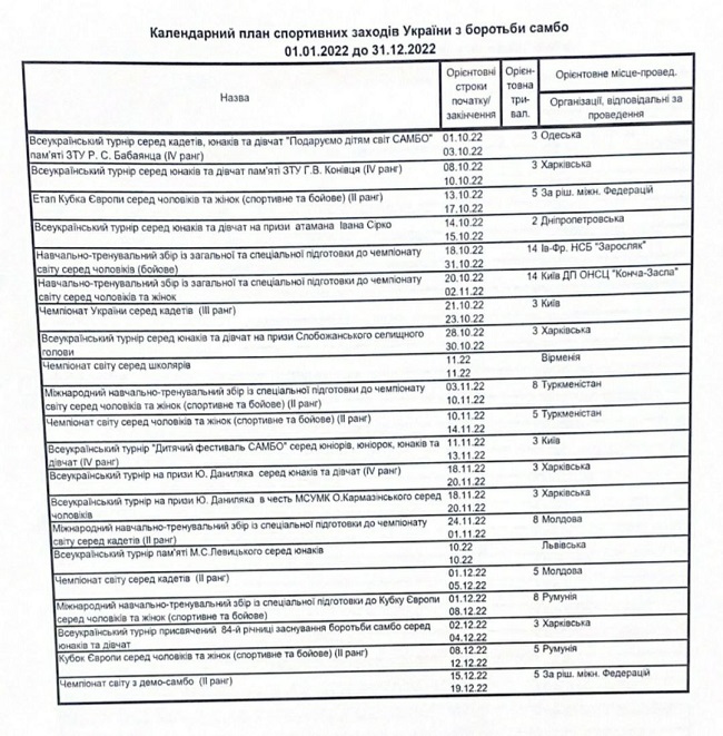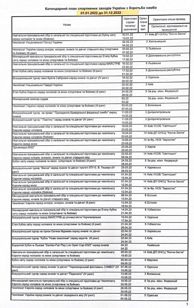 До вашої уваги - проєкт календаря заходів Національної федерації самбо України на 2022 рік. Пропозиції щодо внесення корективів надсилати впродовж цього тижня.