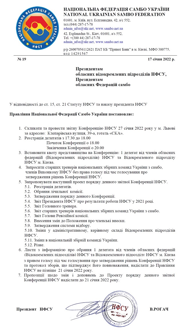 27 січня у львівському готелі "СКА" відбудеться звітна конференція Національної федерації самбо України. До вашої уваги - порядок денний зборів, а пропозиції щодо його змін і доповнень можна надіслати до 21-го числа.