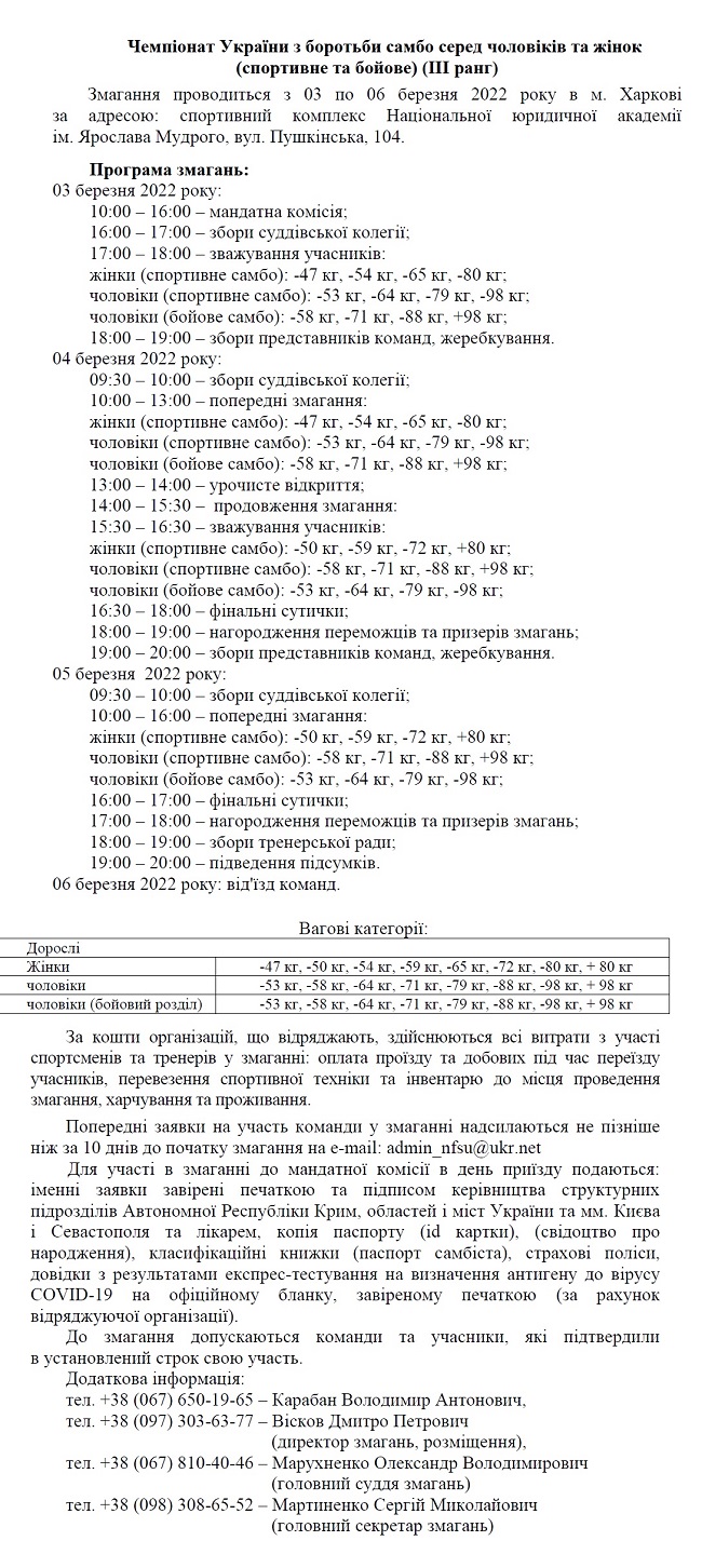 3 - 5 березня Харків прийме чемпіонат України серед чоловіків і жінок зі спортивного і бойового самбо, який пройде у спорткомплексі Національної юридичної академії імені Ярослава Мудрого. 3-го числа - мандатна комісія, 4-го і 5-го - змагання. До вашої уваги - програма турніру і контакти організаторів.