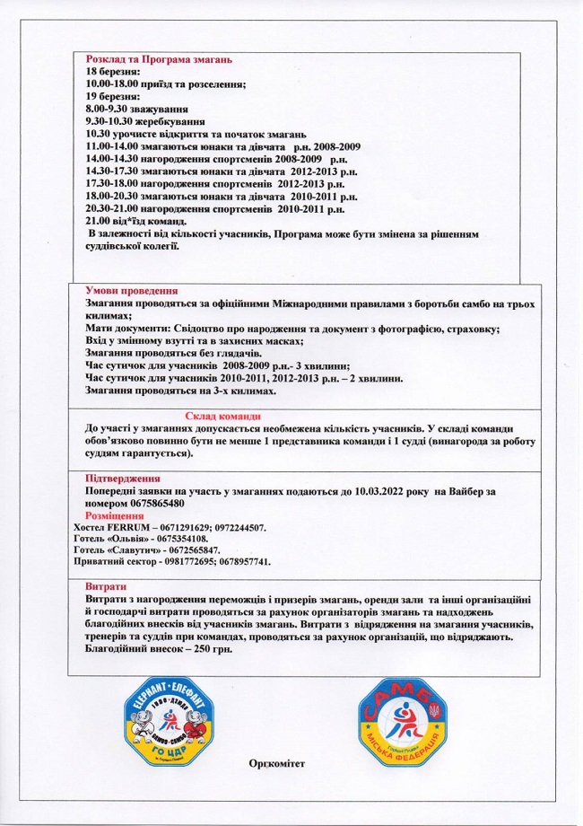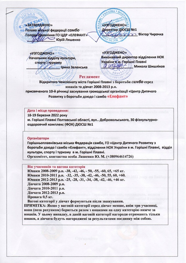 18-19 березня у Горішніх Плавнях Полтавської області пройде відкритий чемпіонат міста, присвячений 10-річчю "Центру дитячого розвитку з боротьби самбо та дзюдо". До участі запрошуються хлопці і дівчата 2008 - 2013 років народження.