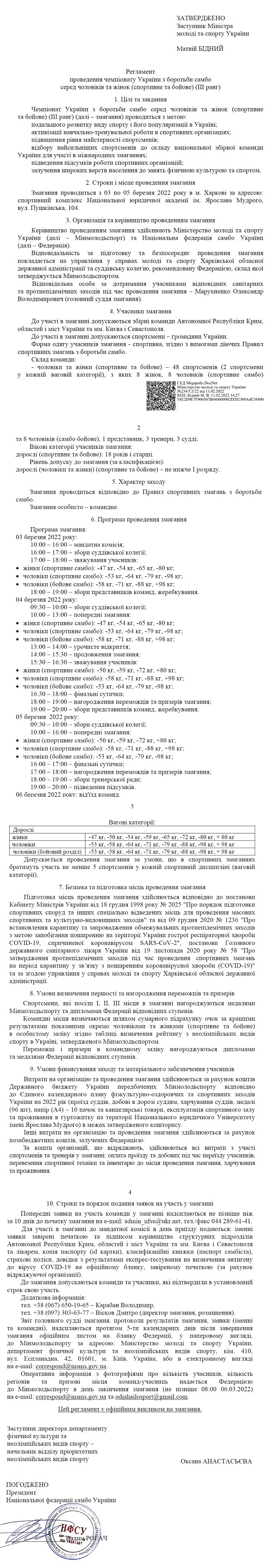 3 - 5 березня у Харкові пройде чемпіонат України серед чоловіків і жінок зі спортивного і бойового самбо. До вашої уваги - регламент змагань, які прийме спорткомплекс Національної юридичної академії.