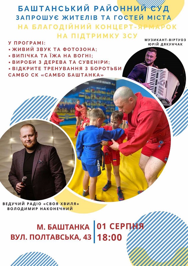 1 серпня на Миколаївщині було проведено благодійний концерт-ярмарок на підтримку Збройних Сил України, ініціаторами якого були Баштанський районний суд та СК «САМБО Баштанка».