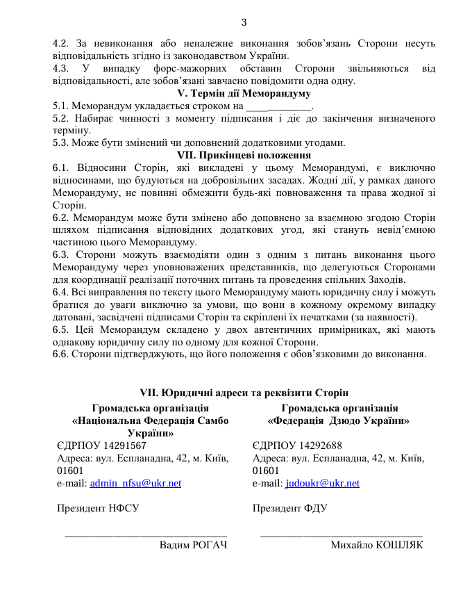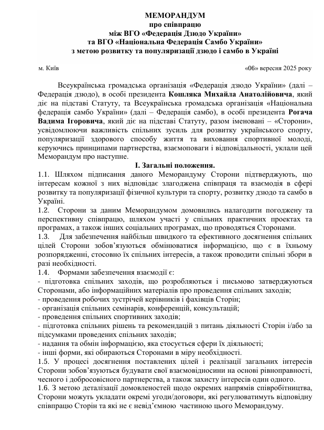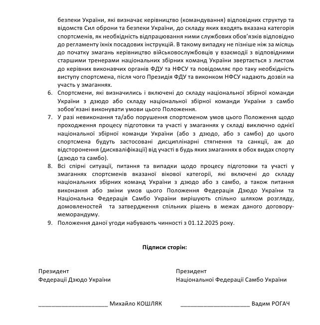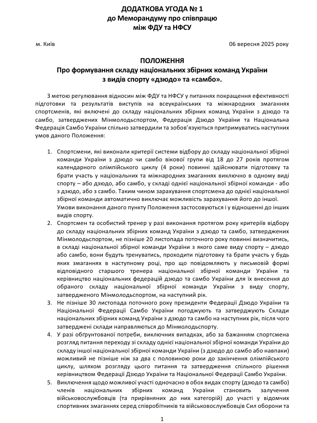 Cторони також підписали додаткову угоду — «Положення про формування складу національних збірних команд України з видів спорту дзюдо та самбо».