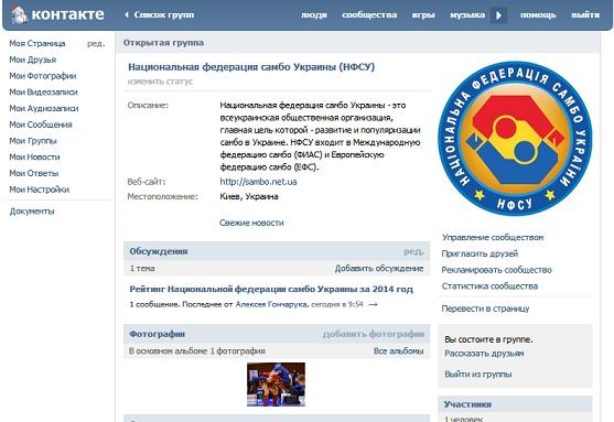 Национальная федерация самбо Украины создала свою страничку в социальной сети "В контакте". Теперь у нас появилось больше возможностей для обмена информацией и обсуждения событий в мире нашего вида спорта.