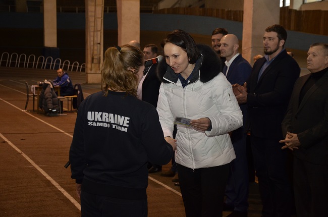 Олена ПІДГРУШНА вручає самбістам нові спортивні звання