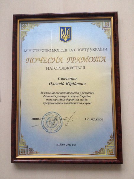 У субботу, 28 лютого, на урочистому відкритті чемпіонату України з самбо заступник міністра молоді і спорту Олена Підгрушна вручила почесну грамоту за вагомий внесок у розвиток фізичної культури і спорту України, популяризацію боротьби самбо, професіоналізм та відданість справі президенту нашої федерації Олексію Савченку.