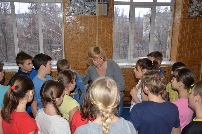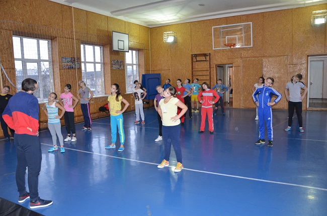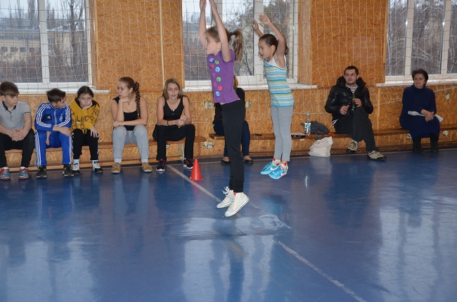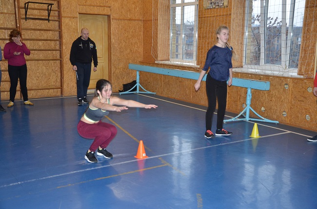 Отже, у шкільному спортзалі змагалися дві вікові групи - молодша (5, 6, 7 класи) і старша (8, 9, 10 класи). Це була естафета з чотирма "станціями", де треба було виконати певний вид вправи: для молодших - по 10 разів, для старших - по 15 (на фото - учасники чекають на стартовий свисток).