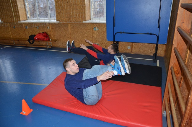 Другий пункт "маршруту" - випробування м'язів пресу (на фото - правильність виконання вправи демонструють Олексій Заєць і Владислав Бова):