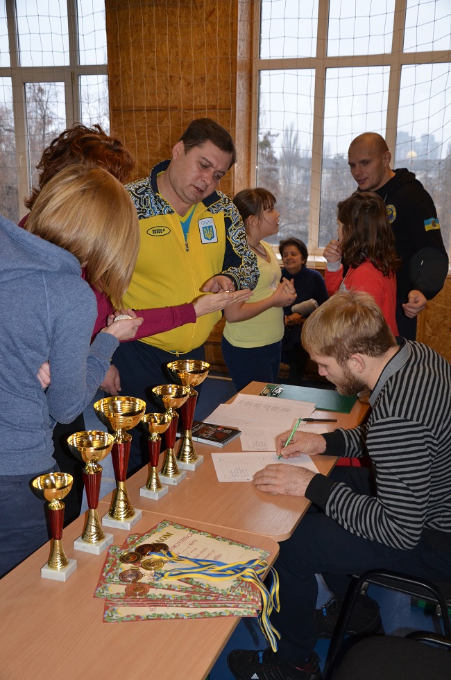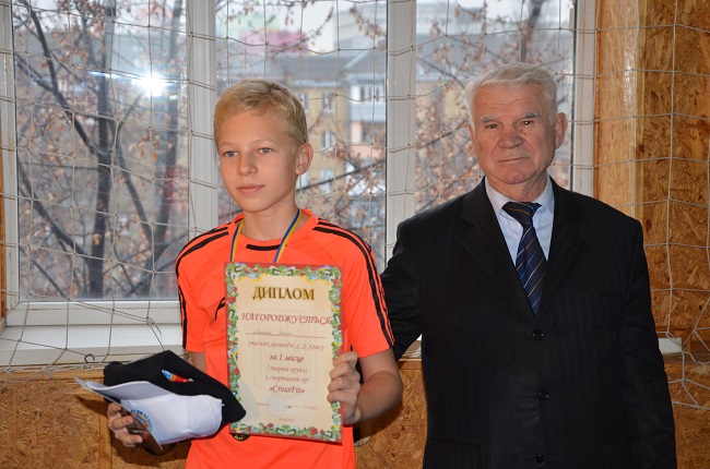 Звичайно ж, призерів відзначили подарунками від НФСУ - медалями, кубками, футболками й бейсболками із логотипом організації (на фото - головний тренер збірної України Олександр Наухатько вітає переможця):