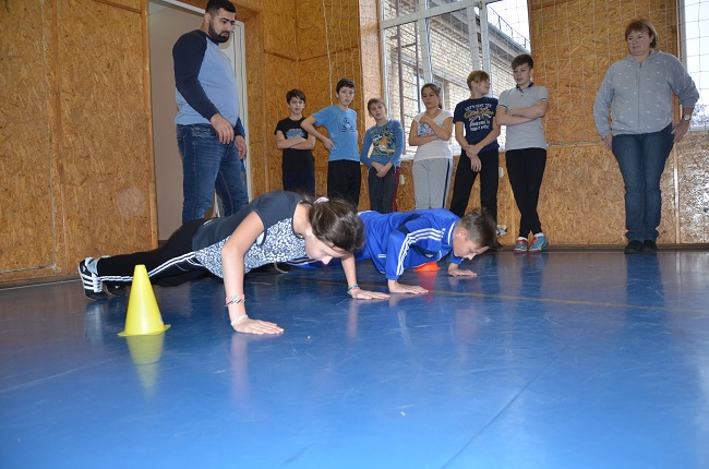 Третя "станція" - віджимання від підлоги (на фото - учасників молодшої групи контролює Размік Тоноян):