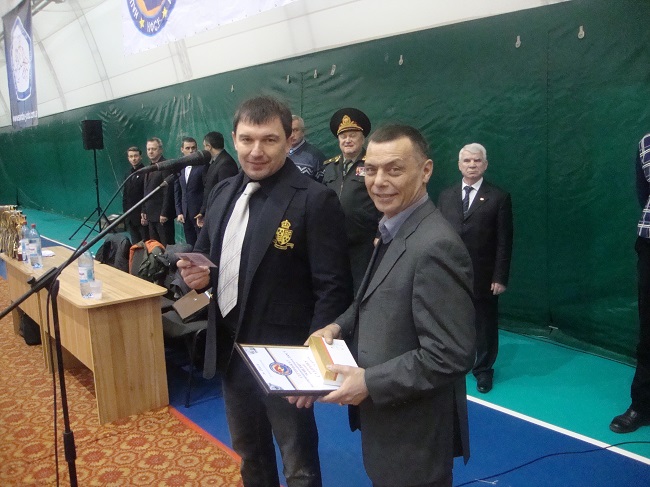 Віце-президент НФСУ Євген ЦВЄТКОВ вітає Вахіда САБІРОВА з 50-річним ювілеєм.