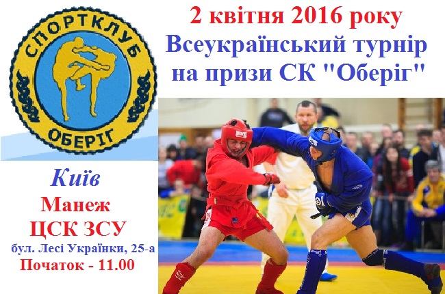 2 квітня в Києві відбудуться поєдинки традиційного Всеукраїнського турніру на призи спортивного клубу "Оберіг". У змаганнях виступлять чоловіки - як у спортивному самбо, так і бойовому розділі. Запрошуємо спортсменів - на килим, глядачів - на трибуни.
