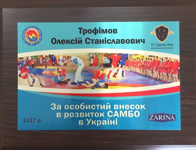 Виконавчий директор НФСУ і президент Київської федерації самбо Юрій Скрипаль нагородив надійного партнера і друга федерації Олексія Трофімова, заступника голови Департаменту освіти й науки, молоді й спорту столиці за внесок у розвиток нашого виду єдиноборств. Про Олексія Станіславовича можна сказати, що це справжня людина спорту.