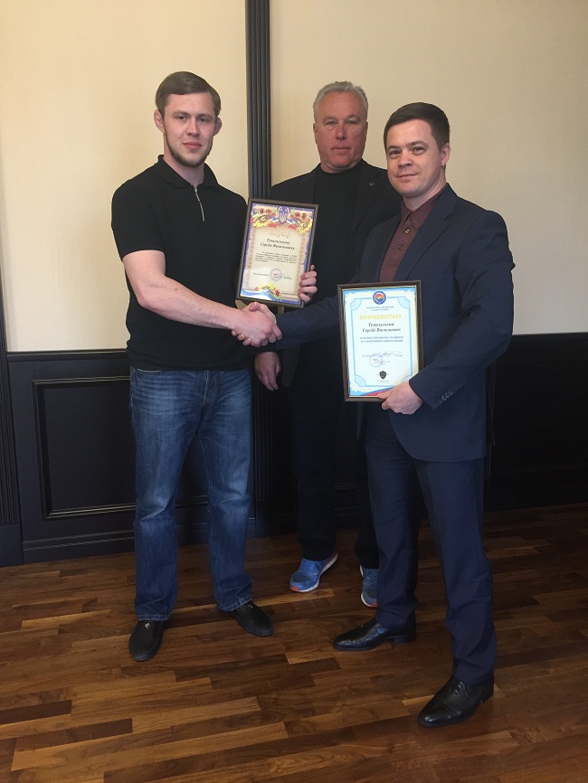 НФСУ продовжує знаходити однодумців, які готові допомагати єдиноборствам, зокрема - самбо. Федерація обмінялася "вірчими грамотами" з очільником столичної митниці Сергієм Тупальським (на фото - праворуч), який багато робить для залучення дітей до спорту. Так, за ініціативи Сергія Васильовича у Рівненській області відкрита школа з боротьби для того, щоб юне покоління вело здоровий спосіб життя і мало для цього всі можливості, не дивлячись на матеріальне становище: кому потрібна допомога - той її отримує. Це співзвучно з нашою програмою "Забери дитину з вулиці", старт якій було дано влітку 2016-го і яка вже приносить вагомі результати.