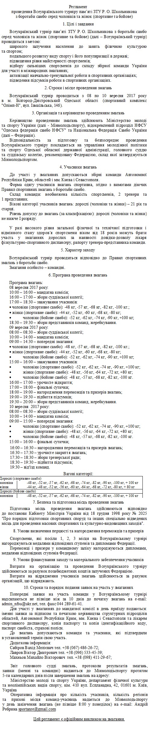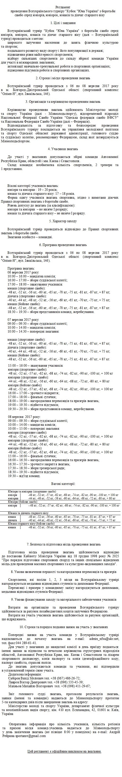 Штурм фортеці в Білгороді-Дністровському Одеської області пройде у дві великі хвилі. Спочатку з 6-го по 8-ме вересня на Кубку України демонструватиме свою майстерність молодь (до 18 і до 20 років), а з 8-го по 10-те виступатимуть дорослі на турнірі пам'яті основоположника українського самбо Романа Школьнікова. У програмі як перших, так і других змагань - три види: спортивне самбо у чоловіків і жінок, а також бойовий розділ. Обидва турніри - відбіркові до складу національних збірних усіх трьох вікових категорій (юнаки й дівчата, юніори й юніорки, чоловіки й жінки).