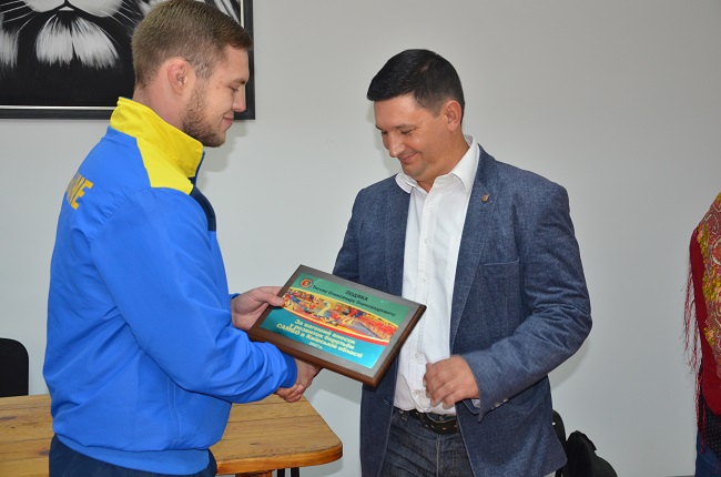 Віце-президент НФСУ Юрій СКРИПАЛЬ вручає відзнаку Олександру ТИГОВУ.
