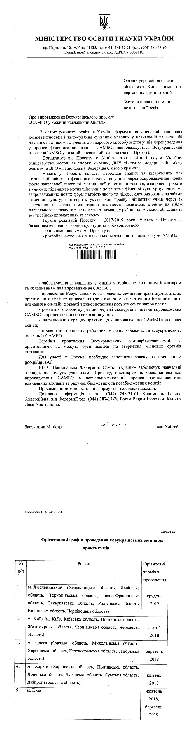 Публікуємо документи, які затверджують старт Всеукраїнського проекту "САМБО в кожний навчальний заклад". Також Міністерство освіти й науки України затвердило орієнтовний графік семінарів-практикумів.