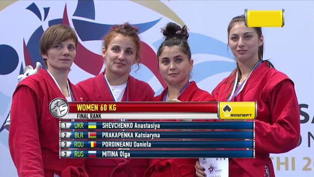 У перший змагальний день чемпіонату світу в російському Сочі на церемонії нагородження пролунав гімн України. Анастасія Шевченко (Харківська область, "Освіта") здобула "золото" у категорії до 60 кг. Загалом у нашому доробку п'ять нагород: "срібло" - в Анастасії Новікової (Харківська область, "Освіта", до 48 кг) і Андрія Кучеренка (Київ, "Освіта", до 57 кг, бойовий розділ), "бронза" - у Владислава Руднєва (Харківська область, "Динамо", до 74 кг, бойовий розділ) й Ігоря Потєрі (Київ, "Освіта", до 100 кг, бойовий розділ).
