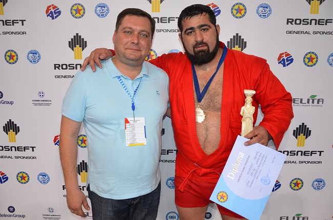 У надважкій категорії зійшлися Размік Тоноян і росіянин Валентин Молдавський, до речі, вихованець української школи самбо. На жаль, Размік поступився супернику. він, як і рік тому, ставши срібним призером континентального форуму. На фото - разом з президентом НФСУ Вадимом Рогачем.