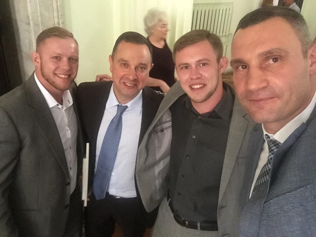 Столиця вже почала святкувати День фізичної культури і спорту. В рамках цієї події представники Національної федерації самбо України зустрілися з керівниками Києва. На світлині - мер Віталій Кличко, віце-президент НФСУ Юрій Скрипаль, директор департаменту молоді і спорту КМДА Вадим Гутцайт, старший тренер молодіжної збірної хлопців Вадим Скрипаль.