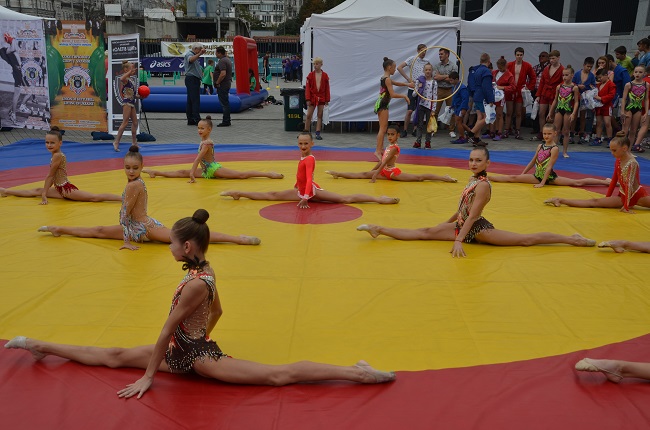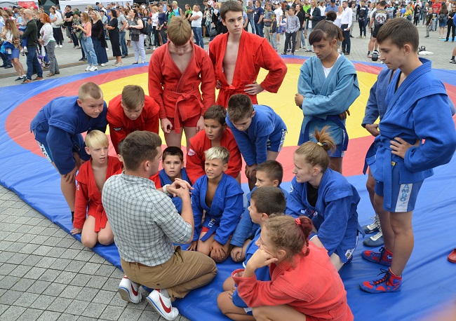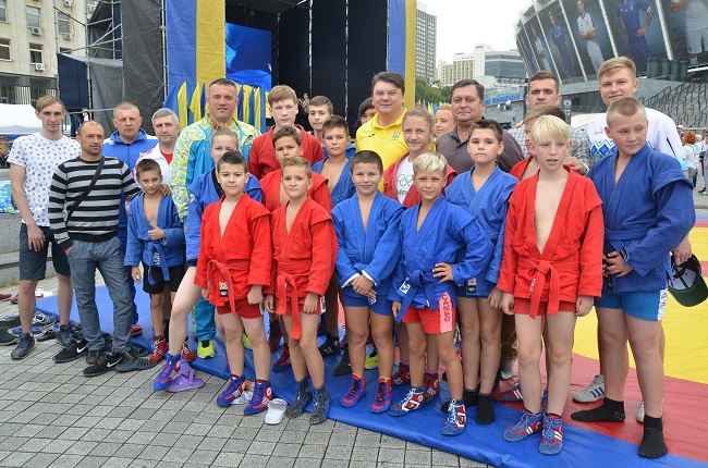 У другу суботу вересня самбісти разом з представниками інших федерацій відсвяткували День фізизної культури і спорту! Яскраве дійство відбулося на головній арені країни - НСК "Олімпійський". Наш килим був у центрі уваги, на ньому побував і міністр молоді і спорту Ігор Жданов (на фото вище). Самбісти поділилися своєю ареною і з юними художніми гімнастками, яких тренує Вікторія Безсонова, мати олімпійської призерки Анни Безсонової.