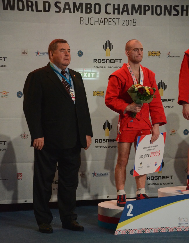 На жаль, не вдалося подовжити "золотий" шлях ще одному чемпіону Європи-2018 Олександру Воропаєву (до 57 кг, Одеська область). Він (на світлині з президентом ФІАС Василем Шестаковим) у рівному поєдинку поступився росіянину Олександру Нестерову.