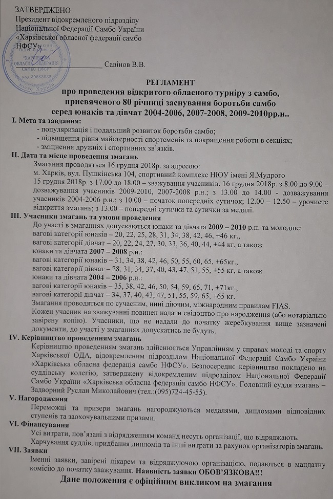 16 грудня у Харкові відбудеться відхритий обласний турнір, присвячений 80-річчю заснування боротьби самбо. Змагання відбудуться у спорткомплексі Національного юридичного університету.