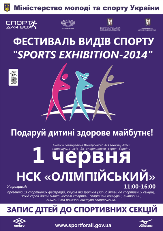 Всеукраїнський центр фізичного здоров’я населення «Спорт для всіх» за сприяння Міністерства молоді та спорту України з нагоди Міжнародного дня захисту дітей 1 червня 2014 року на території НСК «Олімпійський» проводить Всеукраїнський фестиваль видів спорту «Sports exhibition-2014».