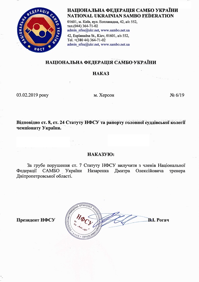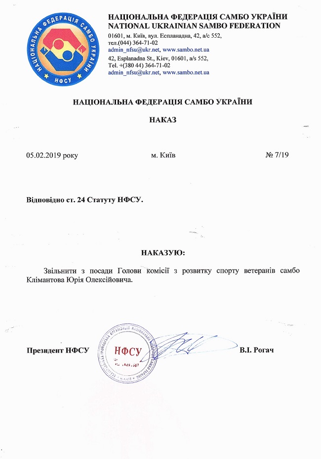 У НФСУ відбулися кадрові зміни. Юрія Клімантова звільнено з посади Голови комісії з розвитку спорту ветеранів самбо, а тренера Дмитра Назаренка вилучено із членів Національної федерації самбо України.