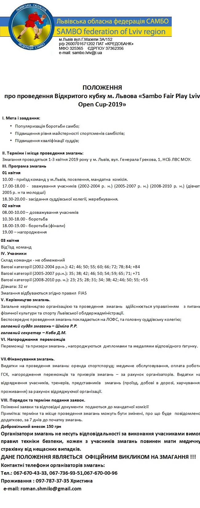 Відкритий кубок "Sambo Fair Play Lviv Open Cup-2019" пройде 1 - 3 квітня. Змагання у місті Лева прийме спорткомплекс, що стоїть на вулиці Грекова, 1.