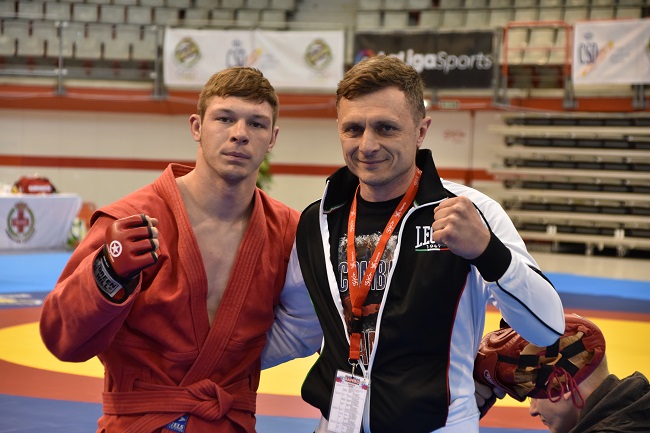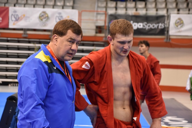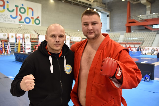 Серед найважчих "бойовиків" (понад 100 кг) Віталій ГРЕБЕНЮК із Одеської області суперничав із Кирилом СІДЕЛЬНІКОВИМ із Росії. Хоча Віталій і програв, але дав серйозний бій досвідченому опоненту. На світлині - разом зі старшим тренером збірної з бойового розділу Сергієм ГРАБОВСЬКИМ.