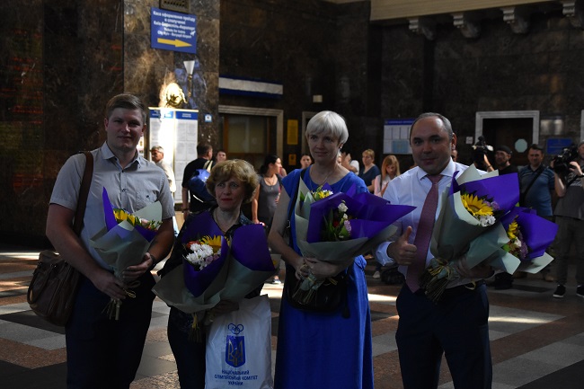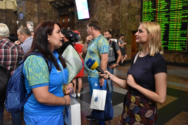 А після виходу спортсмени і тренери відразу ж потрапили "у полон" представників ЗМІ. Звичайно ж, першою увагу до себе привернула чемпіонка Анастасія Сапсай.