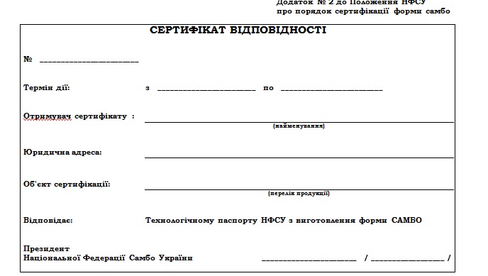 звертається до Національної Федерації Самбо України (НФСУ) з проханням провести сертифікацію форми самбо, видати сертифікат відповідності і дозвіл на право застосування знака відповідності.