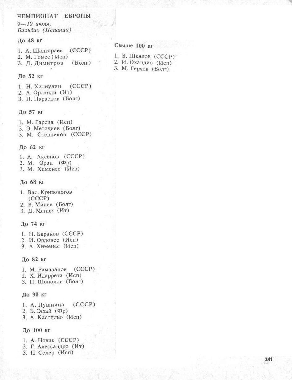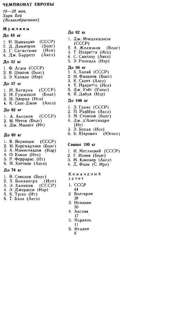 IV чемпионат Европы. 19-21 апреля 1982 года. Варна До 48 кг 1. Р. Стоилов (Болгария) 2. К. Байшулаков (СССР) 3. А. Маркуньо (Испания) До 52 кг 1. И. П...