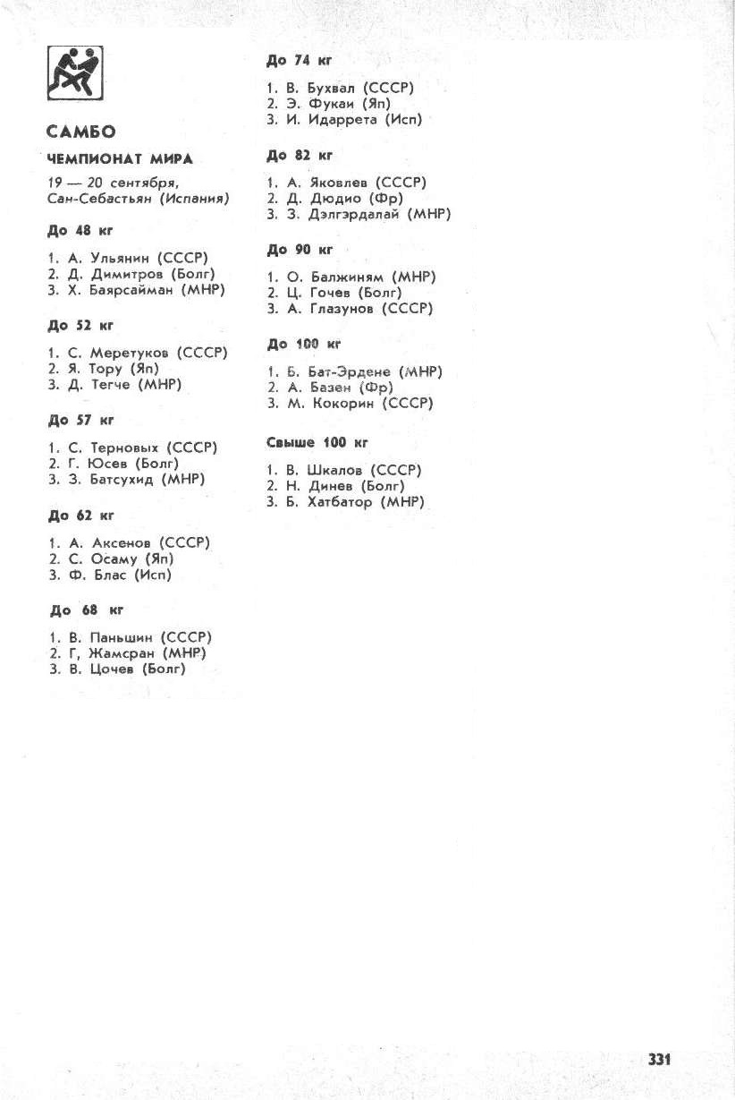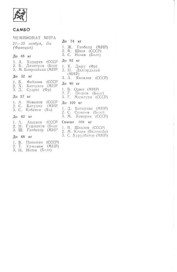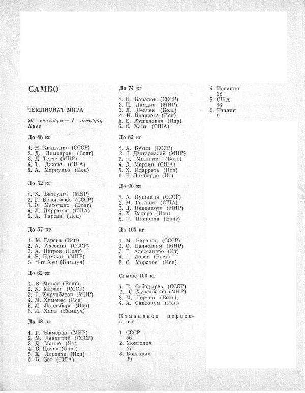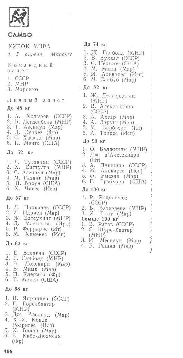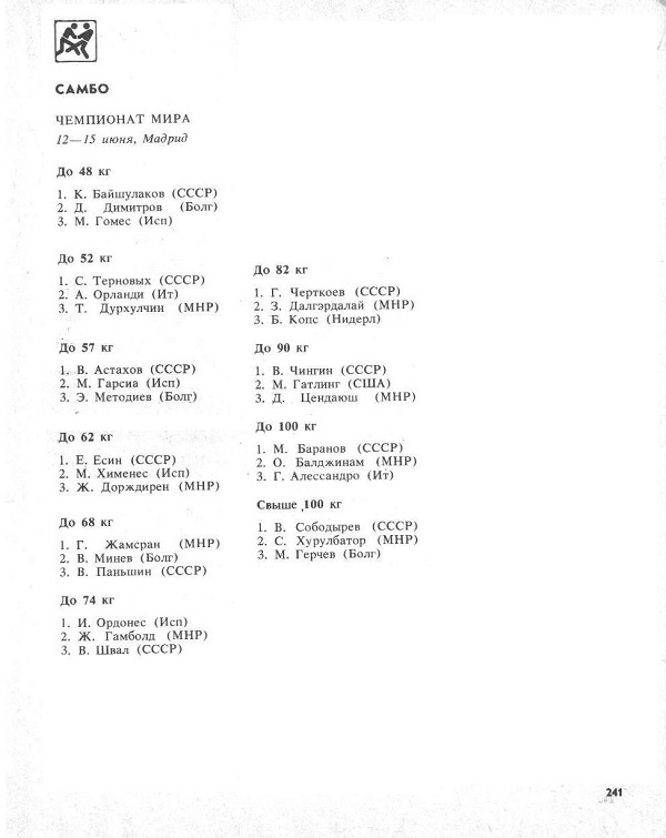 XVIII-й Чемпионат СССР по самбо проходил в Москве с 26 по 29 декабря (категории до 60 кг, до 68 кг, до 77 кг, св. 85 кг) и в Минске с 18 по 20 декабря...